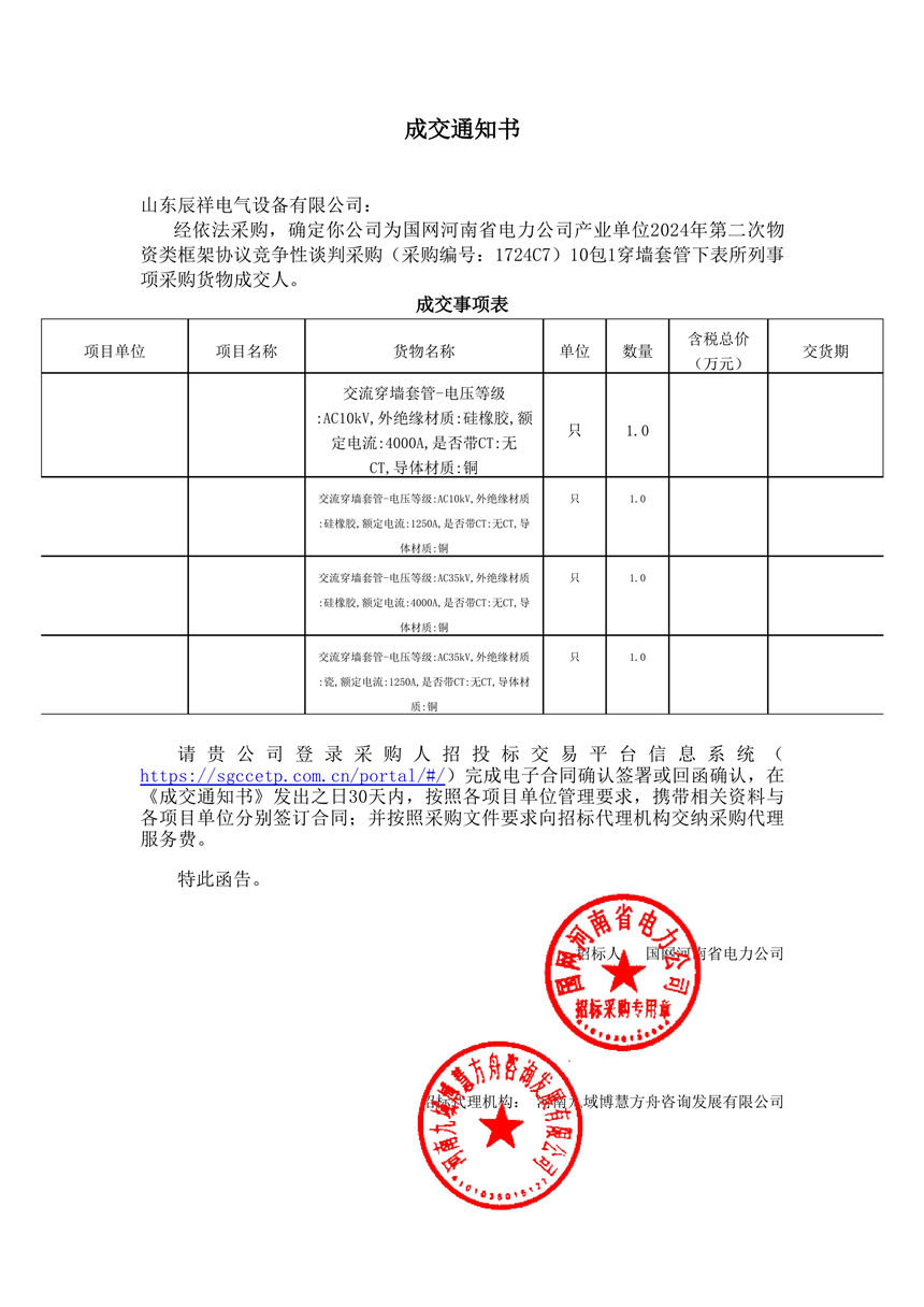 交流穿墻套管中標通知書